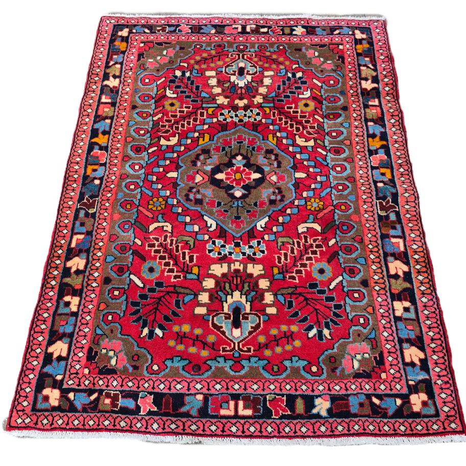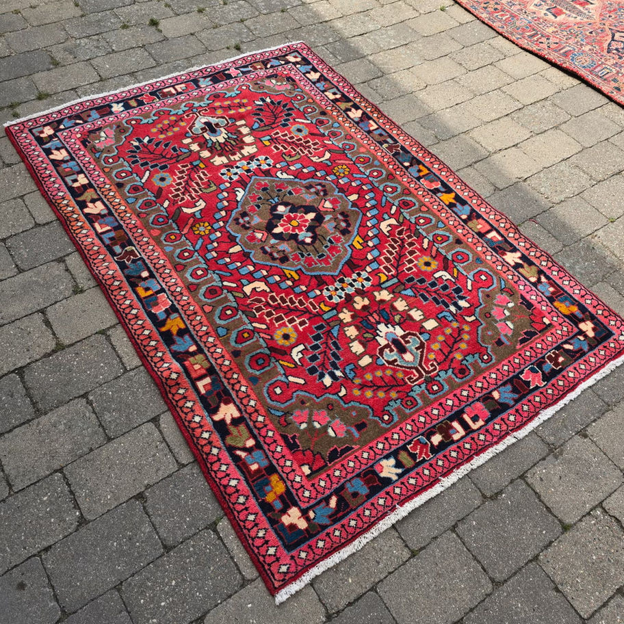 Newly cleaned and in excellent condition, this Persian Hamadan rug is handwoven in wool on a cotton foundation. It features a lively multifloral motif in vibrant shades of blue, red, orange, and yellow, reflecting the rich color tradition and spirited artistry of Hamadan weaving. A bright and expressive piece that brings warmth and character to any setting.