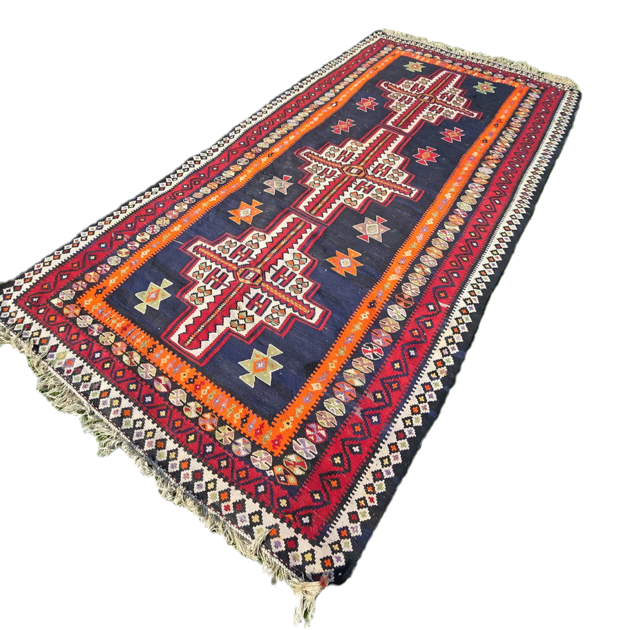 In good condition, this distinguished Persian Kilim is handwoven in wool on a cotton foundation. It features a dynamic palette of deep blue, rich red, and vibrant orange, arranged in bold geometric symbols. A striking example of traditional tribal design, it brings energy and character to any space.