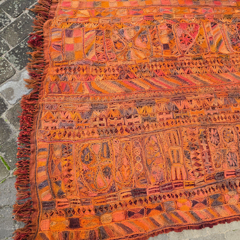 Tæppet er fyldt med små geometriske motiver og fint syarbejde, der viser det grundige håndværk bag. Det har en rig tekstur og en helt særlig karakter, som kommer af alder og brug.