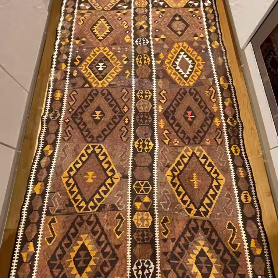 Håndvævet i 100 % uld og prydet med markante geometriske mønstre i en rig blanding af jordfarver. Nyligt rengjort og i meget god stand udtrykker tæppet den styrke og varme, der kendetegner de kurdiske vævetraditioner.