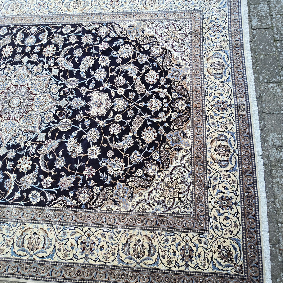 Dette elegante persiske Nain tæppe er håndknyttet med stor præcision og viser den klassiske raffinerede stil, som Nain-vævninger er kendt for. Tæppet har en dyb mørkeblå bund, hvor et detaljeret blomster- og arabesk mønster udfolder sig omkring en central medaljon.
