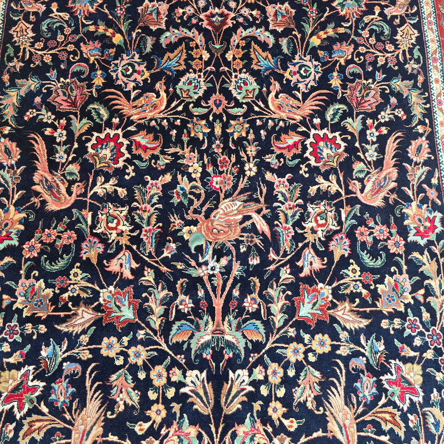 Dette raffinerede persiske Tabriz-tæppe har et elegant Livets Træ-motiv på en dyb midnatsblå bund. I modsætning til de klassiske medaljon-designs udfolder kompositionen sig mere frit og organisk, hvor blomstrende grene og fugle bevæger sig naturligt hen over fladen.