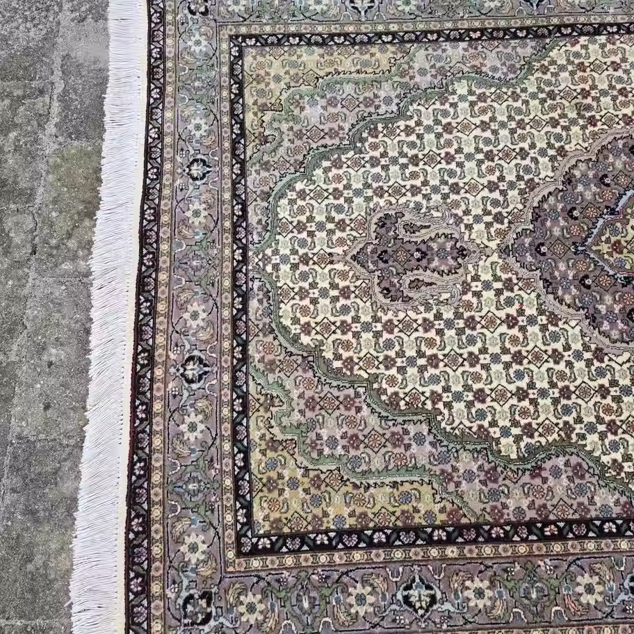 Nyligt rengjort. Dette Persiske Tabriz 50 Raj-tæppe er håndknyttet i silke og uld på en bomuldsbund og har det klassiske Mahi-mønster. Farverne – jadegrøn, hvid og vinrød – er afdæmpede og skaber et roligt og harmonisk udtryk. Et tæppe med en stille elegance og den præcision, der kendetegner Tabriz’ anerkendte værkstedstradition.