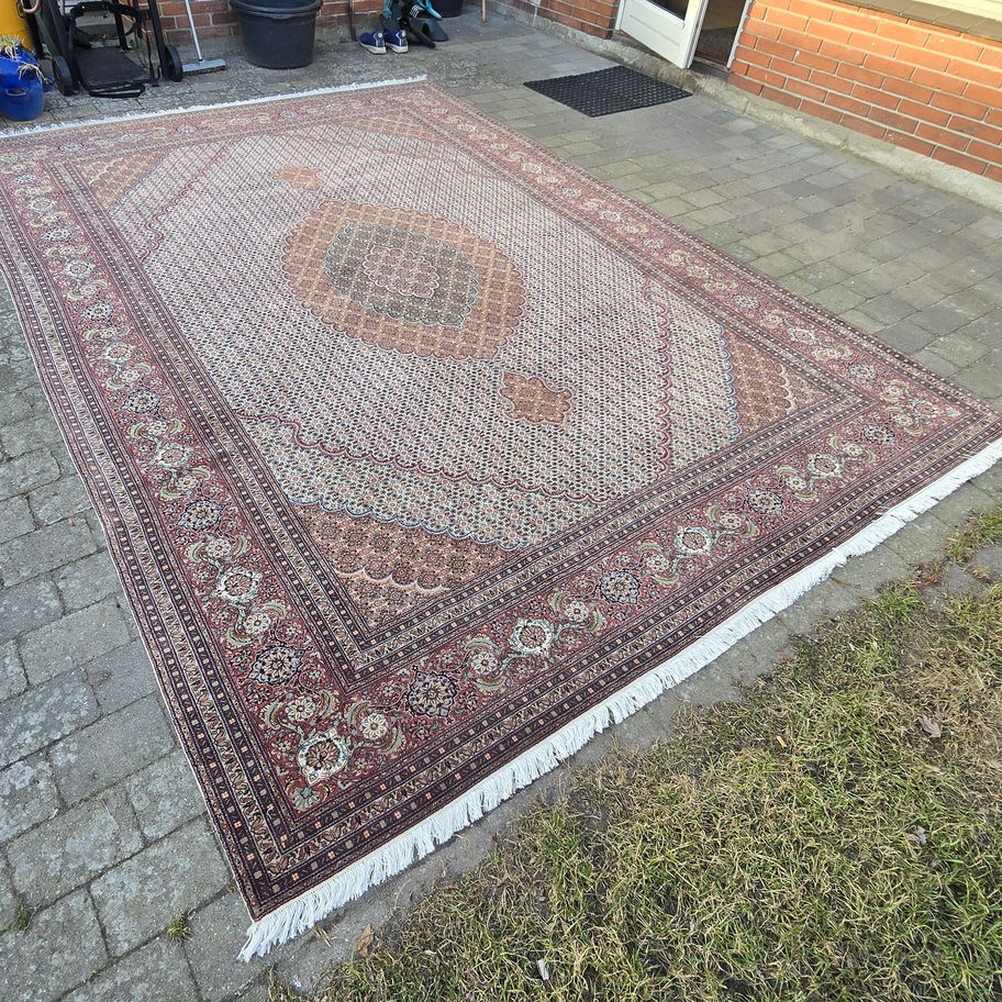 Et smukt og fint knyttet persisk Tabriz tæppe med det klassiske Mahi (Herati) mønster, et af de mest kendte og tidløse designs i persisk tæppekunst. Hele feltet er fyldt med tusindvis af små gentagende ornamenter – inspireret af stiliserede fisk eller blade – der danner et tæt og harmonisk mønster.