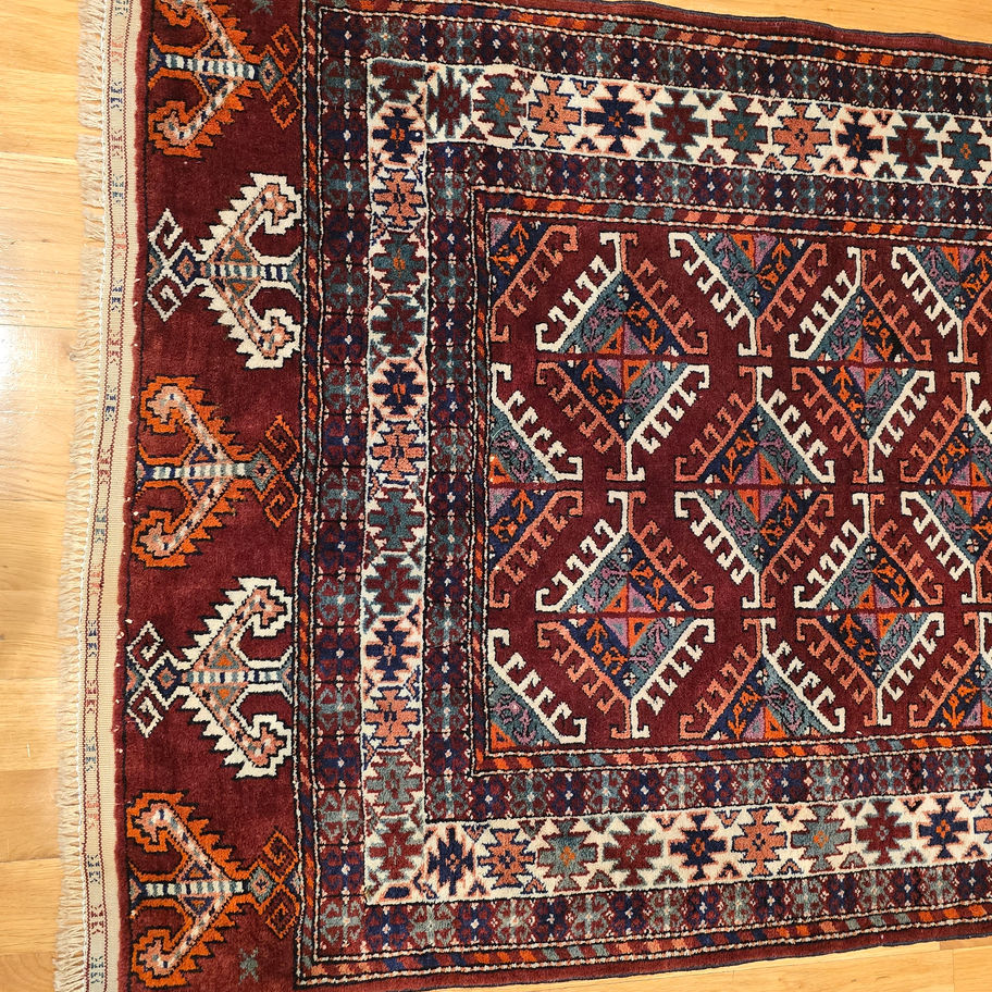 Dette håndknyttede Turkoman tæppe har et stærkt, geometrisk udtryk med tydelig tribal karakter. Midterfeltet er opbygget af gentagne, kantede motiver arrangeret i et harmonisk mønster, som giver ro og struktur.