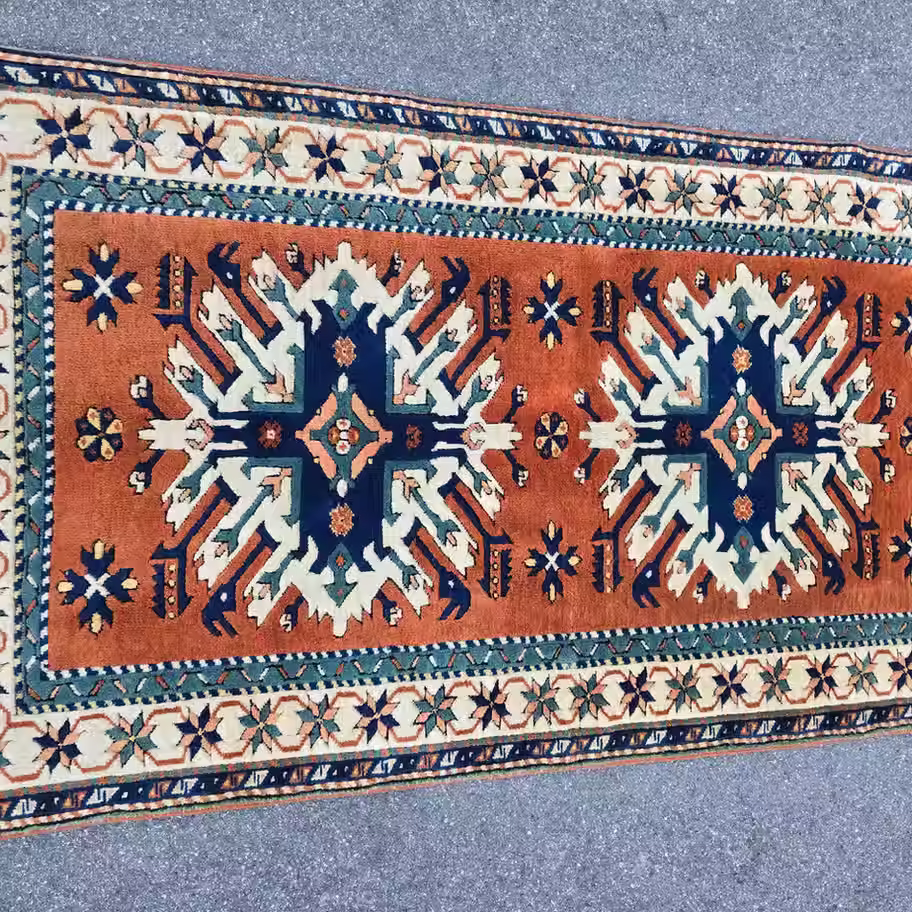 A finely woven Turkish Kars rug, 104 x 184 cm, wool on wool, featuring a vibrant orange field adorned with traditional Caucasian star motifs. The design is complemented by a light-toned border with an elegant rosette chain pattern. Recently cleaned, this piece offers a thick, durable construction and a robust feel underfoot—an excellent example of classic Anatolian craftsmanship.