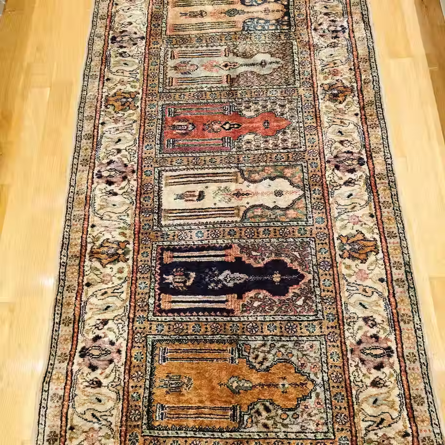 Newly cleaned and in good condition, this Turkish Kayseri Saaf is handknotted in silk on a cotton foundation and features a beautifully intricate composition of eight finely detailed panels, each offering its own scene of artistry and imagination. The palette—gold, blue, rose, and beige—reflects the formal elegance of traditional silk weaving, its tones shimmering softly across the design. Graceful and meticulously executed, this Saaf embodies the refined splendor and narrative charm of Kayseri’s celebrated silk tradition.